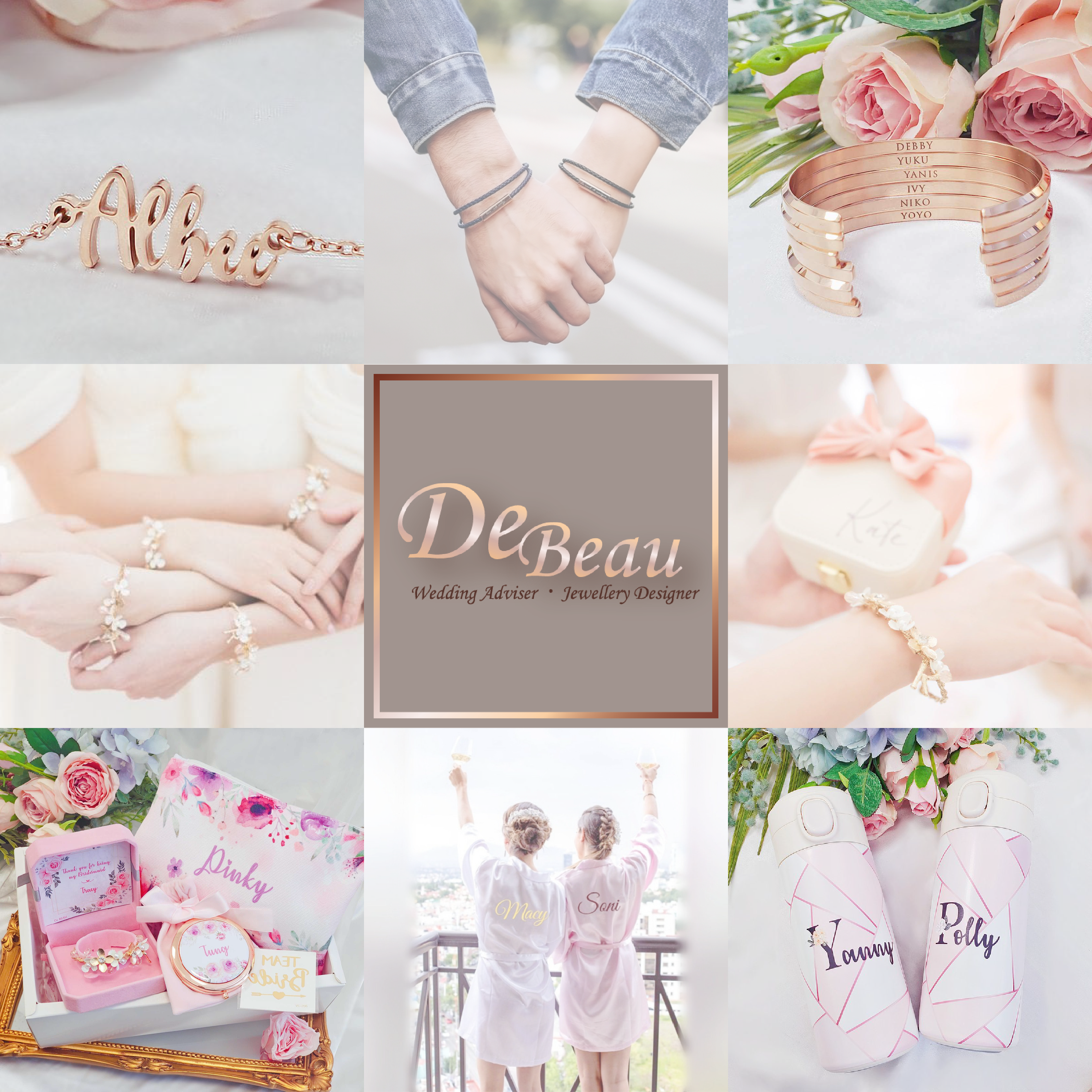 從最初的囍帖、手腕花、首飾(手鏈、項鏈、戒指、耳環等)開始,De BEAU 的客製化禮品便深受客人喜愛,訂單源源不斷。我們緊跟潮流,不斷拓展產品線,現已涵蓋 bridal shower 的睡袍、睡衣、圍巾/披肩、手袋,以及兄弟團的煲呔、袖扣、懷舊酒壺等,可謂「包羅萬有」,滿足婚禮中各個環節的需求。